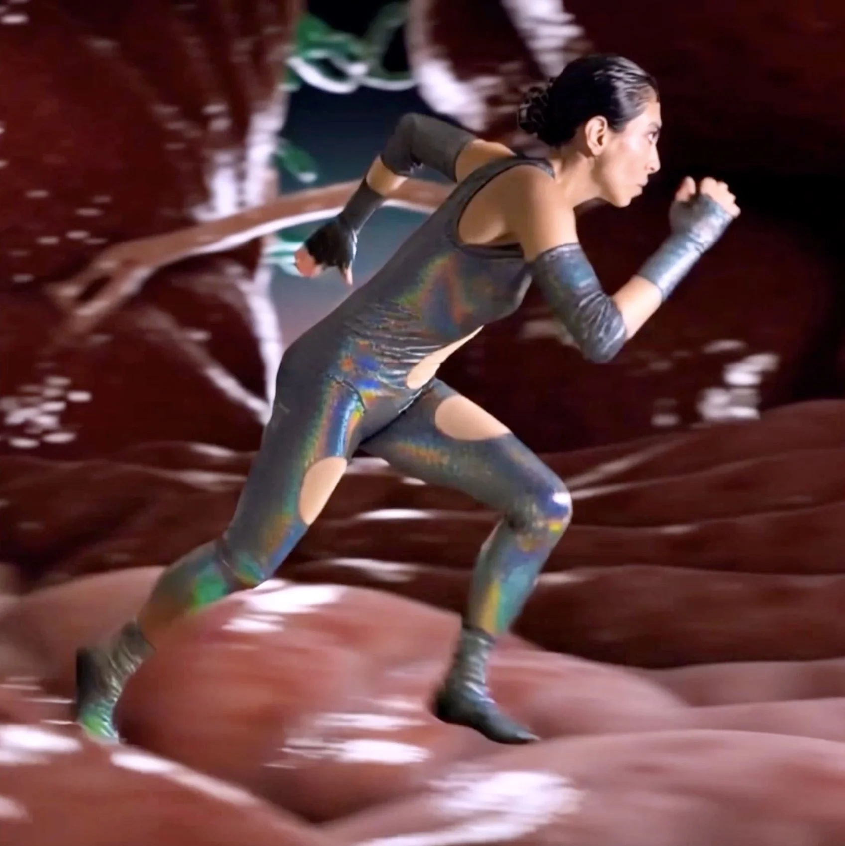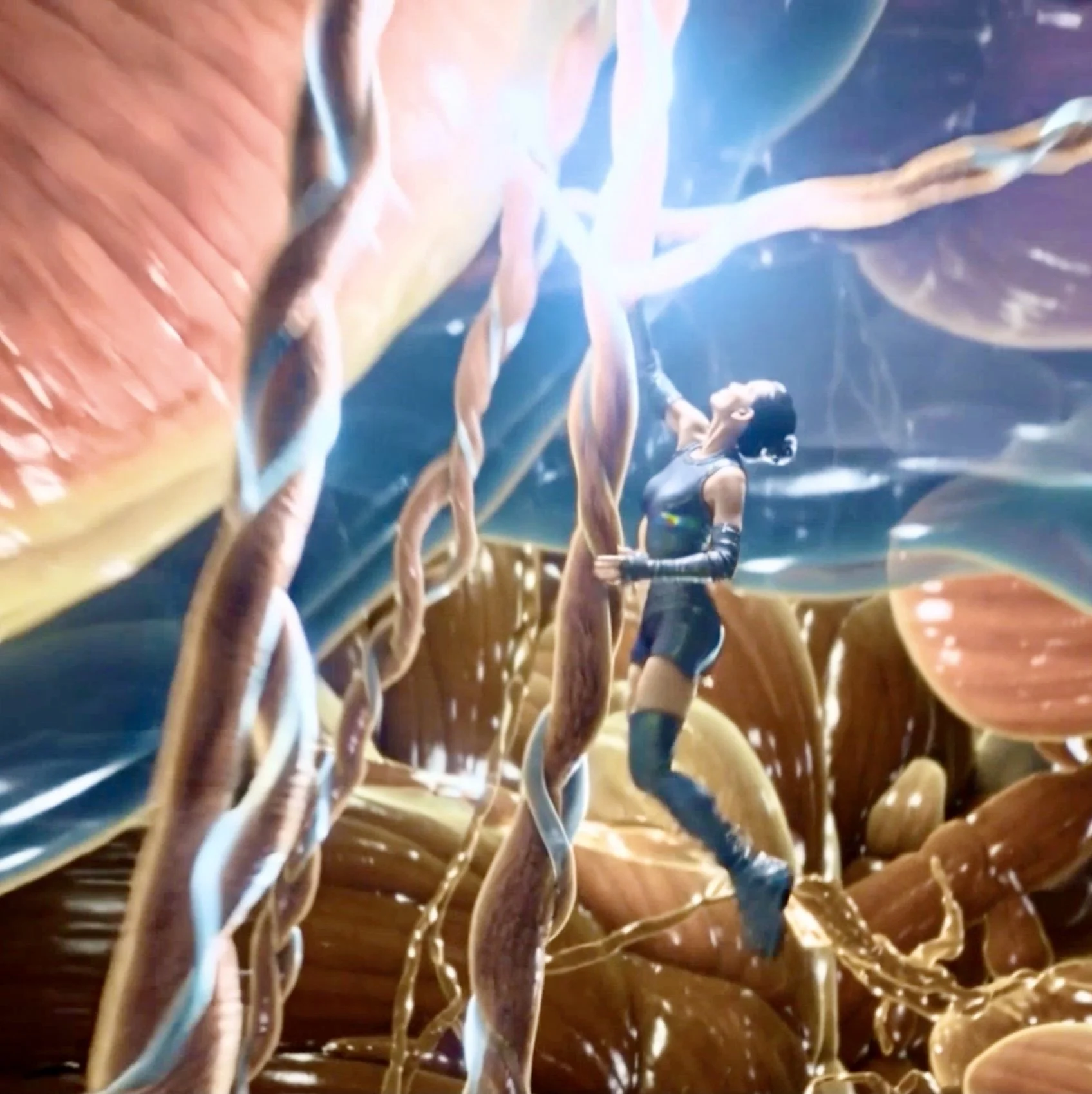 A microscopic inner - space warrior woman fight s her way through the fantastical but harrowing tunnels, tubes and chamber s of a human body– searching to destroy a malevolent growth threatening the