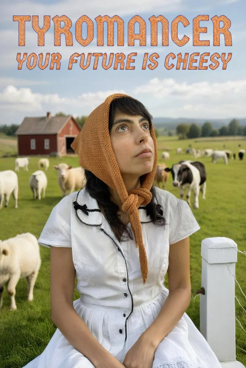 My sessions as Tyromancer provide a compelling scenario for every participant: cheese-tasting paired with a visual and material experience guide each subject to a fateful crossroad. With the courage to sample three cheeses (cow, goat, sheep), comes the courage to journey onward.